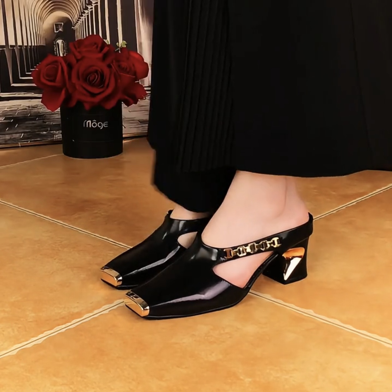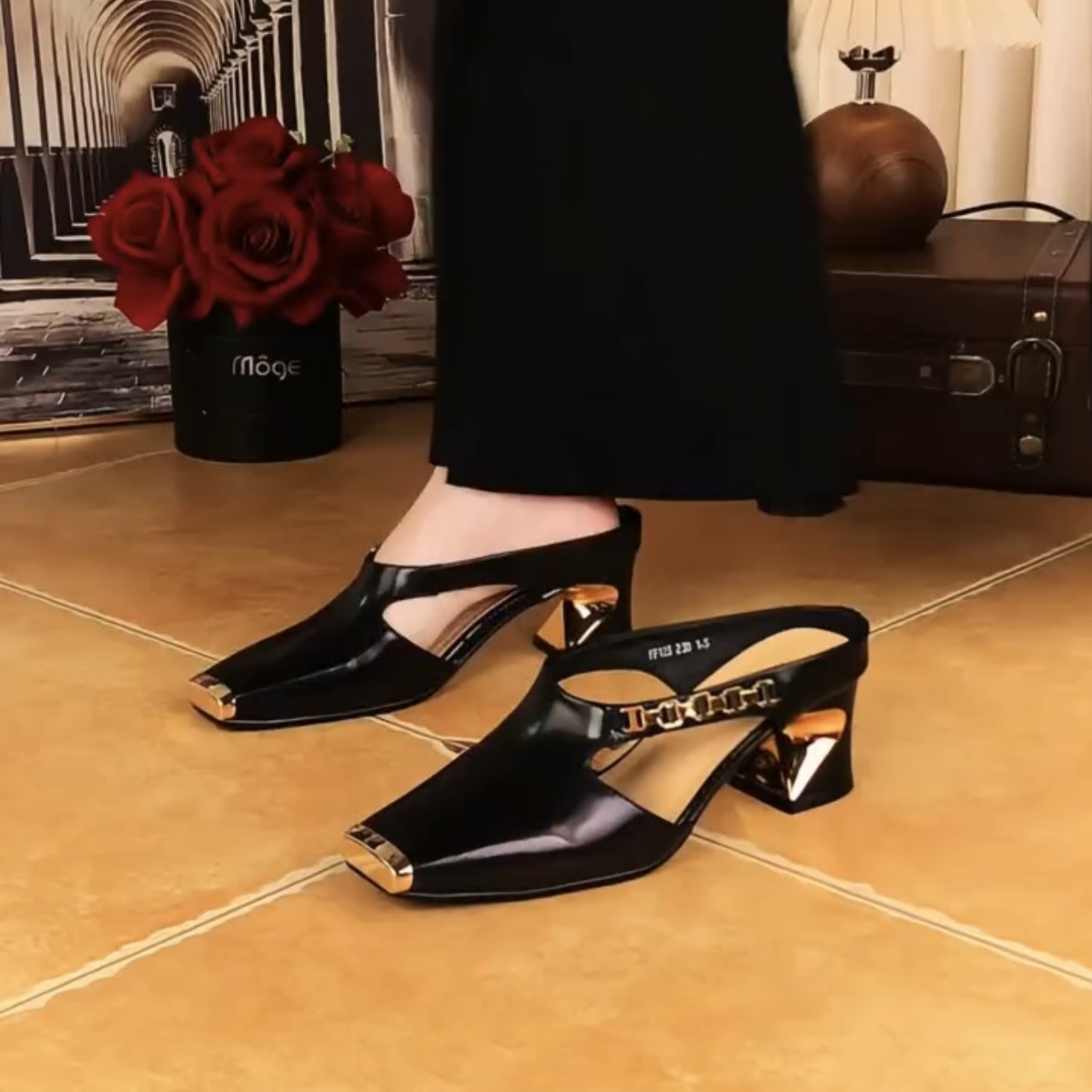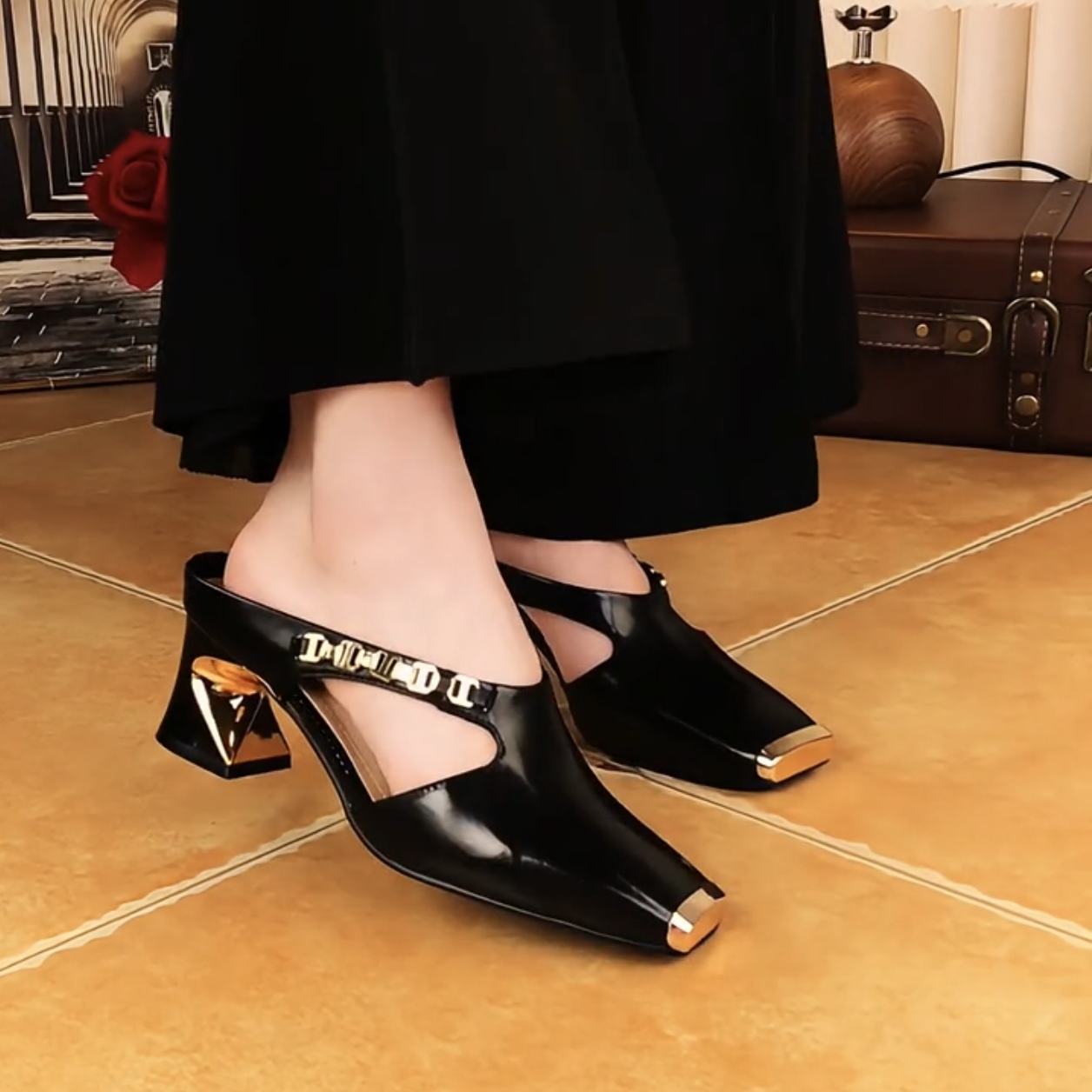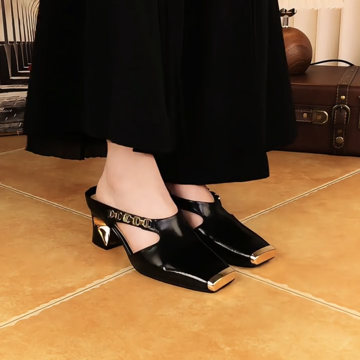 Women's Casual Metal Square Toe Mid Block Heel Mules